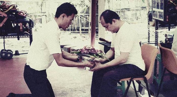 24.สมัยเมื่อก่อน ผมเรียนกับท่านปรมาจารย์เขตร เข้าไปก็ไม่ใช่ว่าขึ้นครูกันเลยนะครับ ถ้าเข้าไปขึ้นครูก่อนนี่แย่เลย บางทีเรียนไป ๒ ,๓ วันทิ้ง หนี ขึ้นครูซะแล้ว ไม่ใช่นะครับ ครูบาอาจารย์ท่านจะดูว่าคนไหนรักวิชาจริงหรือไม่ อย่างผมเรียน ๓ เดือนขึ้นไปนะครับ ท่านถึงเรียกให้มาขึ้นครู การขึ้นครูก็มี ขัน ผ้าขาวม้า ดอกไม้ ธูปเทียน เงิน ๖ บาท นะครับ และเมื่อขึ้นครูแล้ว ก็ถือว่าจบ ขึ้นครูแล้วไม่มีครอบ ไม่มีอะไรต่อนะครับ ขึ้นครูทีเดียวก็จบแล้ว
