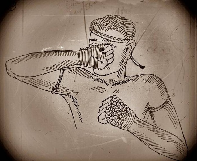 33.สมัยก่อนนี่ เค้าจะคาดเชือกกันเวลาขึ้นสังเวียน หรือจะไม่คาดนั่นก็แล้วแต่ พอคาดเสร็จเค้าเอาลูบหน้าตัวเองให้ดู ลูบหน้าตัวเองเพื่อแสดงความบริสุทธิ์ใจ แล้วเวลาคาดเนี่ย เค้าก็จะนั่ง มีพี่เลี้ยงคาดมือละคนเลยนะครับ ท่านปรมาจารย์บอกว่า คนไทยไม่ใช่ว่าโหดร้ายถึงขนาดเอาแก้วไปโรย เอาอะไรไปโรย เวลาคาดเชือก คาดเสร็จไม่ใช่เอาไปจุ่มน้ำนะครับ คาดเสร็จปั๊ปเค้าก็พ่นน้ำ พอแห้งปั๊ป มันจะตึงเป๊ะเลย แล้วการถักก้นหอย ถักก็ได้ไม่ถักก็ได้ อย่างโคราชก็จะถักโตๆ ไชยาก็จะถักเรียงเล็กๆ แข็งปึ๊ก โดนก็เหมือนแก้วเลย